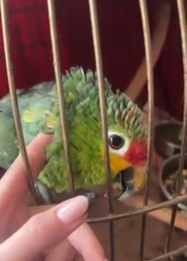 - "Here's a brief description of the video: A person's hand is petting a green parrot inside a golden cage" by FM-nOJlk1, licensed under CC BY 4.0