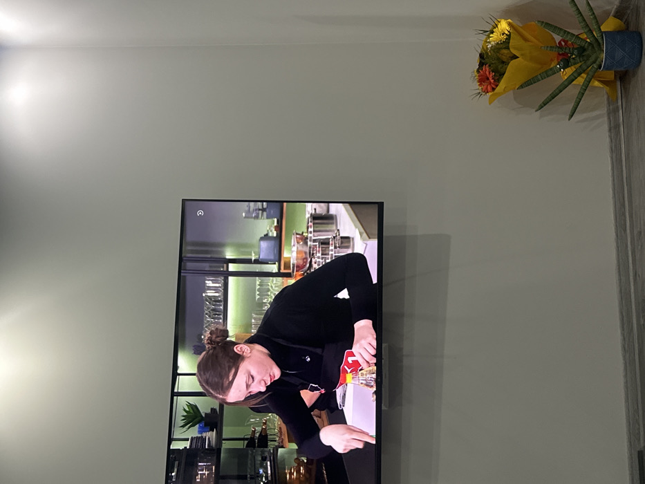 An indoor scene in Panagyurishte, Bulgaria, depicts a room with light-colored walls and a light wood-patterned floor. A large flat-screen television is mounted on the left wall, displaying a culinary program. On the screen, a young Caucasian female with light brown hair in a bun wears a black long-sleeved shirt and a black apron, actively preparing food with a utensil over a white surface. A small red and white bottle with a yellow cap and a "1" label is visible on the surface. The background of the television screen reveals a modern kitchen setting with green walls, shelves holding glassware, and stainless steel pots. Below the television, a white wall mount and partially visible wires are present. In the bottom right corner of the room, positioned against the wall, is a bouquet of yellow and orange flowers wrapped in bright yellow paper, placed next to a potted plant with star-shaped, dark green leaves in a blue patterned ceramic pot. Overhead lighting illuminates the upper portion of the walls.