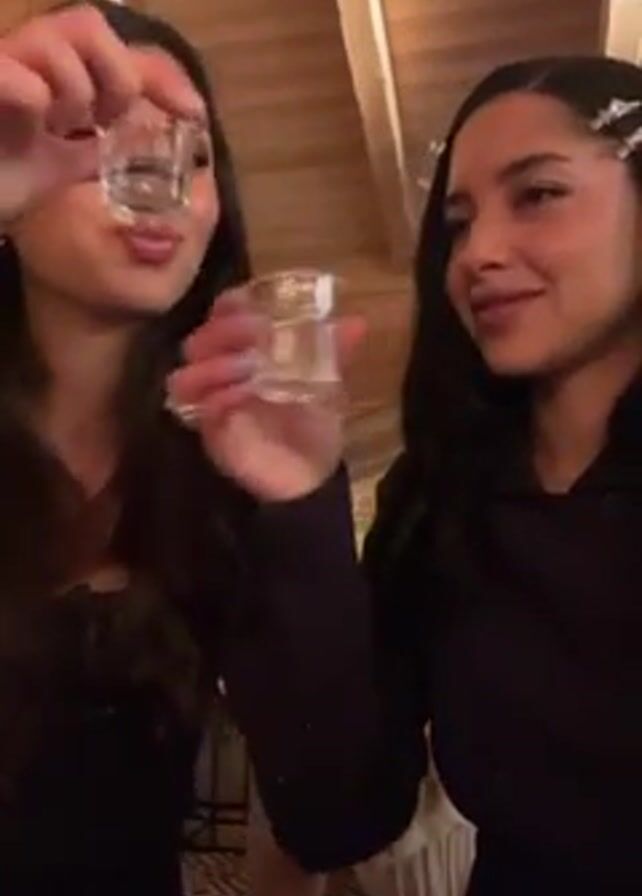 Two young women are in what looks like a cabin with wood beam ceilings. They are holding shot glasses and appear to be making a toast. They then drink their shots, make a face, and look at the camera. They are both wearing dark clothes.