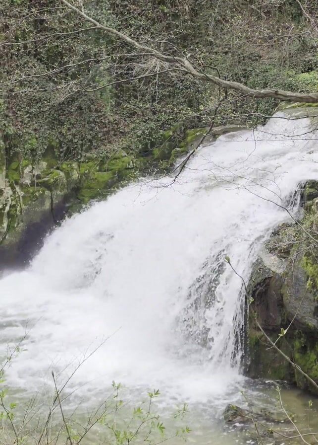 The video depicts a small waterfall cascading over rocks into a pool of water. Lush green vegetation, including moss and ivy, covers the surrounding rocks and trees. Bare branches from nearby trees frame the top of the scene. The water is white and foamy as it rushes down, creating a dynamic, natural landscape.