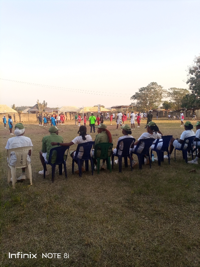 A field with people in uniform playing a sport. Some people in white, and some in green. A referee in bright green oversees the game. A row of people sit in chairs watching the activity. The chairs are plastic and colored blue, green, and white. The grass is dry. Buildings and trees can be seen in the background. The sky is clear. A wire runs across the field.