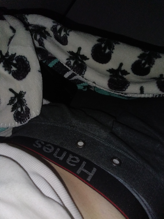 The scene depicts an indoor environment in the city of Park Hill, United States, under low light conditions. The primary subjects are layered textiles and a segment of human skin. A white or cream-colored plush fabric, possibly a blanket or robe, occupies the upper portion of the frame, patterned with repeating dark silhouettes resembling berry clusters and leaves. Beneath this, a dark gray fabric garment, consistent with pants or shorts, is visible, featuring two circular metallic grommets. Directly below, a black elastic waistband with the brand name "Hanes" displayed in gray, inverted lettering, encircles a section of light-toned human skin, suggestive of an abdomen or hip area. To the lower left, a portion of a white ribbed garment, likely an undershirt, is visible. No explicit actions or interactions are discernible; the image presents a static, close-up view of these items.