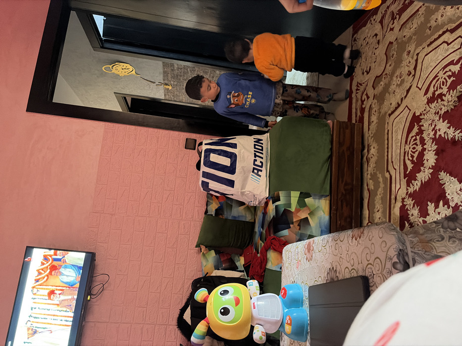 Two young boys stand near an open doorway. One wears an orange shirt, the other a blue "Chase" Paw Patrol sweatshirt. They appear to be in a living room with a patterned rug. A television is mounted on a pink wall. A toy sits on the floor near a couch and a "Action" shopping bag. The room is rotated clockwise.
