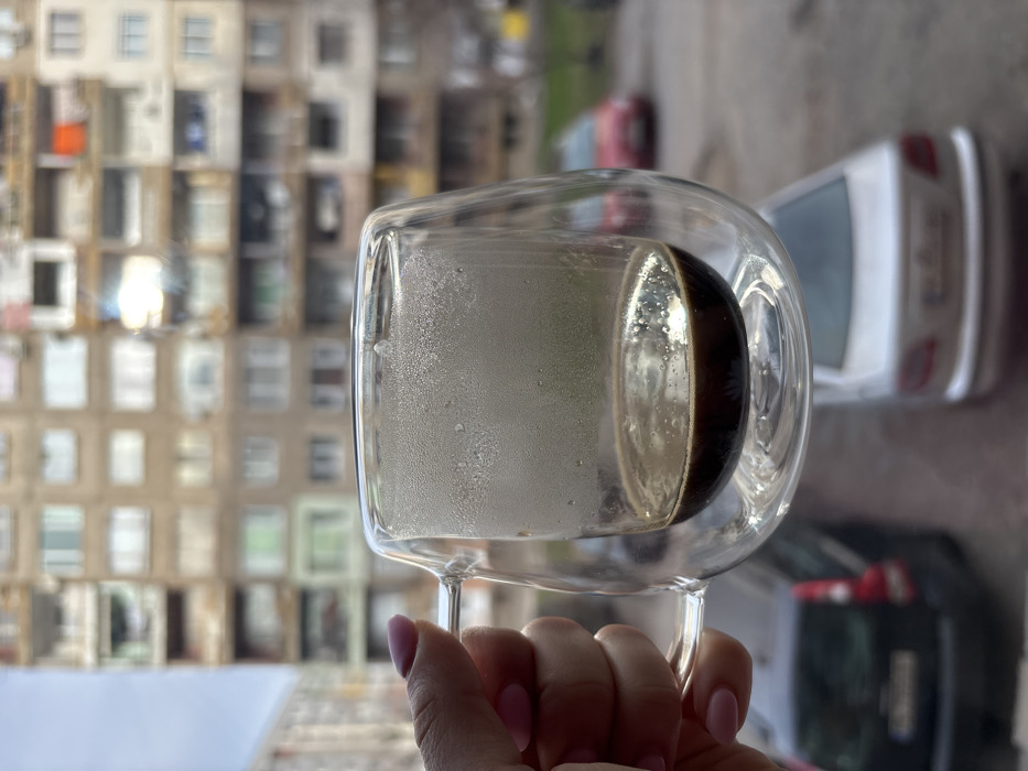 A right hand, adorned with light pink nail polish on the fingernails, grasps the handle of a clear, double-walled glass mug. The mug contains approximately one-third a volume of dark liquid, consistent with coffee or espresso, with a thin layer of lighter foam and small bubbles visible on its surface. Condensation is present on the interior surface of the inner glass layer, above the liquid. The scene is observed from an elevated position, looking down onto an urban environment in Pernik, Bulgaria. In the blurred background, several multi-story residential buildings, characteristic of post-socialist architecture, dominate the frame. These buildings feature numerous windows of varying designs and colors, some with enclosed balconies. A partial view of a paved area is visible below, functioning as a parking space or residential street. Three vehicles are discernible: a dark-colored SUV or station wagon on the left, a silver sedan in the middle, and a red hatchback on the right, all parked. A patch of green vegetation is vaguely visible beyond the street level on the right. The sky overhead appears overcast or diffused.