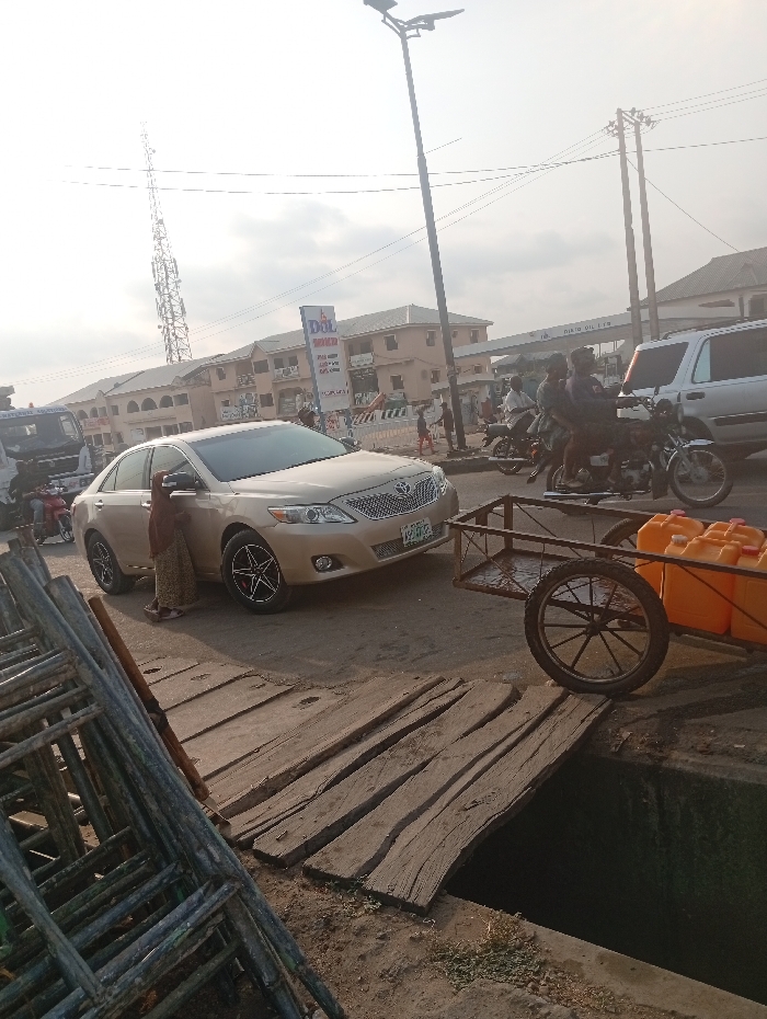 The image captures a busy street scene in Lokoja, Nigeria, specifically near the DOL OIL LTD petrol station on Ganaja Road. In the immediate foreground on the left, a stack of metallic scaffolding poles rests on a dirt patch. To the right, a rudimentary wooden bridge, constructed from several planks, spans an open concrete drainage ditch. Adjacent to the ditch is a two-wheeled utility cart with a metal frame, containing multiple orange plastic jerrycans. A gold-beige Toyota Camry sedan, approximately a 2007-2011 model, with black and silver multi-spoke alloy wheels, is positioned on the paved road, facing slightly left. A person, dressed in a patterned brown garment, stands near the driver's side of the Camry, facing away from the camera. Behind the Camry, the road is occupied by traffic, including at least two motorcycles; one carries three individuals, and another carries two. A silver SUV is partially visible behind the motorcycles. In the mid-ground, the multi-story building of the DOL OIL LTD petrol station is prominent, featuring its red and white logo and a price board displaying 'PMS,' 'AGO,' and 'DPK' rates. A tall, lattice-structured communication tower stands in the far left background. Overhead utility lines and wooden utility poles are visible across the frame. A modern street light, topped with a solar panel, extends upwards from the right side of the road. The sky is bright but hazy or overcast. The overall environment depicts an active urban commercial area under natural daylight.
