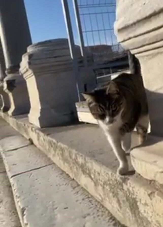 tabby cat standing on a stone ledge next to a row of stone columns. The cat has a white chest and paws, and its fur is a mix of brown and gray stripes. The columns are spaced evenly apart, and there is a grassy area beyond them. In the background, there are some buildings and a clear blue sky. The camera is positioned at a low angle, looking up at the cat and the columns. The cat is looking at the camera for a moment and then turns its head to look down the row of columns. The cat remains stationary.