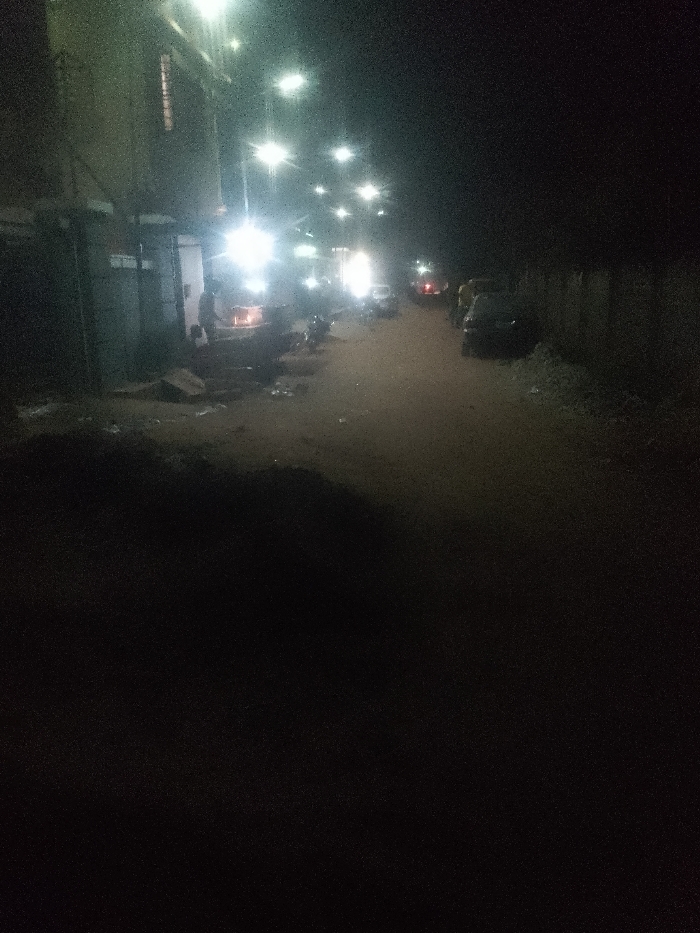 A dimly lit street at night with sparse lighting from streetlights. A building is on the left, with parked cars and motorcycles lining the right side. The road appears unpaved and uneven. A few indistinct figures are visible near the building. The foreground is obscured by darkness.