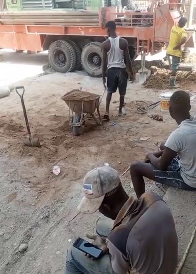 The video depicts an outdoor construction site. In the foreground, a man is sitting on the ground, looking at his smartphone. Behind him, another man is sitting on the ground, looking forward. Further back, a man is walking away from a wheelbarrow filled with sand. Another man, wearing a yellow shirt and boots, is working near a large drilling rig mounted on a truck. The rig is actively drilling, and the surrounding area appears to be muddy. There are several tools, including shovels and buckets, scattered around the site. The scene suggests ongoing construction activities with some workers taking a break.