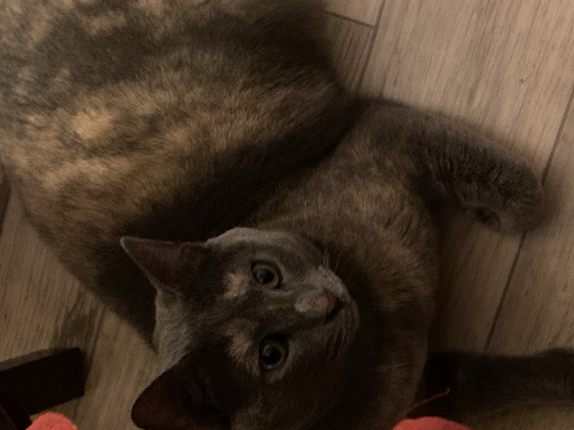 A tortoiseshell cat lies on a light brown wood-patterned floor. The cat is positioned diagonally with its head near the bottom center of the frame, looking up at the camera. Its body extends toward the top left corner. Part of a black object is visible in the bottom left corner, next to a red round object. The location is Björklinge, Sweden.