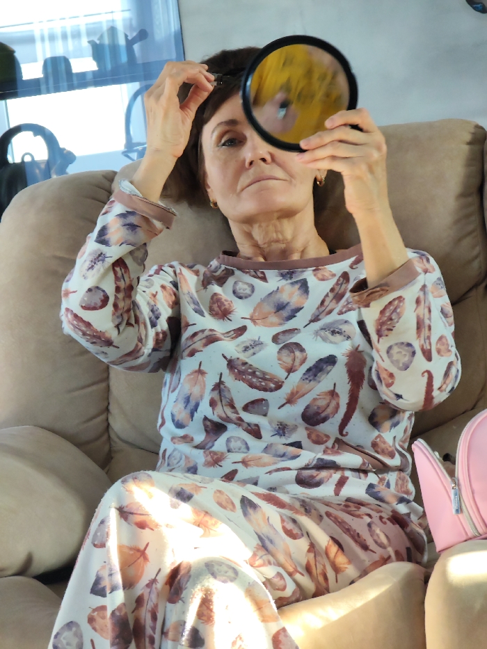 An adult female is depicted seated in a light brown upholstered recliner or armchair within an indoor environment in the City of Unknown, Unknown. She wears a two-piece garment consisting of a long-sleeved top and pants, both patterned with various brown, beige, and purple feathers on a light-colored background. Her right hand holds a small, circular mirror with a black frame, which reflects a blurred yellow image. Her left hand is raised towards her head, holding a dark hair clip or accessory as she appears to adjust her short brown hair. Her gaze is directed into the mirror. A portion of a pink bag is visible on the surface to her right. The background features a window or glass partition, displaying indistinct reflections of interior objects. Natural light illuminates the scene from the left.