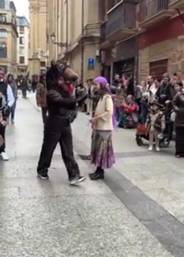 The video captures a street scene with a small crowd gathered on either side of a narrow street lined with buildings. A person in a brown bear costume is chained to a person dressed in a cream jacket, floral skirt, and purple headscarf. The bear and the person it's chained to walk along the cobblestone path, with the crowd observing. Other people can be seen in the background, including a young boy dressed in a mariachi costume. The buildings are multi-storied, with some featuring balconies and varying architectural details. The weather appears overcast.