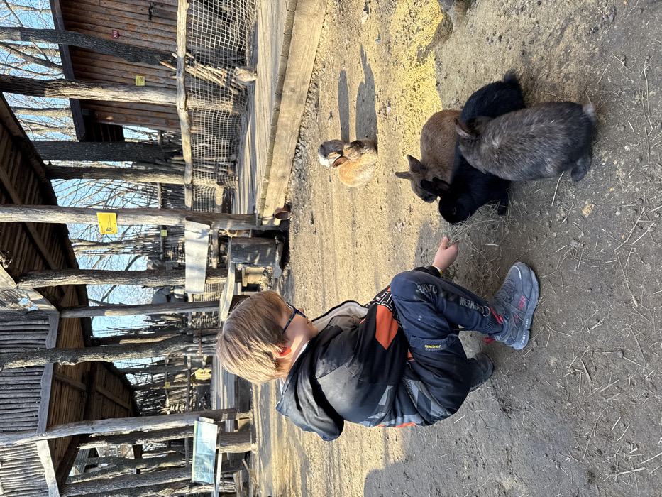 The image displays an outdoor animal enclosure, likely a petting zoo, situated in the city of Shakhty, Russia. A young male child, with light brown hair and wearing glasses, a black and orange jacket, dark blue pants, and grey sneakers, is crouched on a dry dirt ground. He is actively feeding hay held in his right hand to a group of rabbits. Immediately in front of the child, three rabbits—one black, one brown, and one dark grey/black—are clustered, eating from the hay. Further back on the dirt, additional rabbits are visible, including a light brown one lying down and a greyish one sitting upright. Another light grey rabbit is positioned on a raised wooden platform to the right. The background features several rustic wooden structures, including elevated treehouse-like platforms supported by bare tree trunks, wooden benches, and a wooden fence with a net barrier. A wooden building and more bare trees are also present, with a clear blue sky overhead. A yellow rectangular sign with a black pictogram is affixed to a tree trunk on the right. The scene is illuminated by strong sunlight, casting visible shadows.