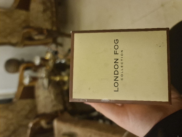 A hand holds a tan box with dark brown trim, displaying the text "LONDON FOG COLLECTION" in a vertical alignment