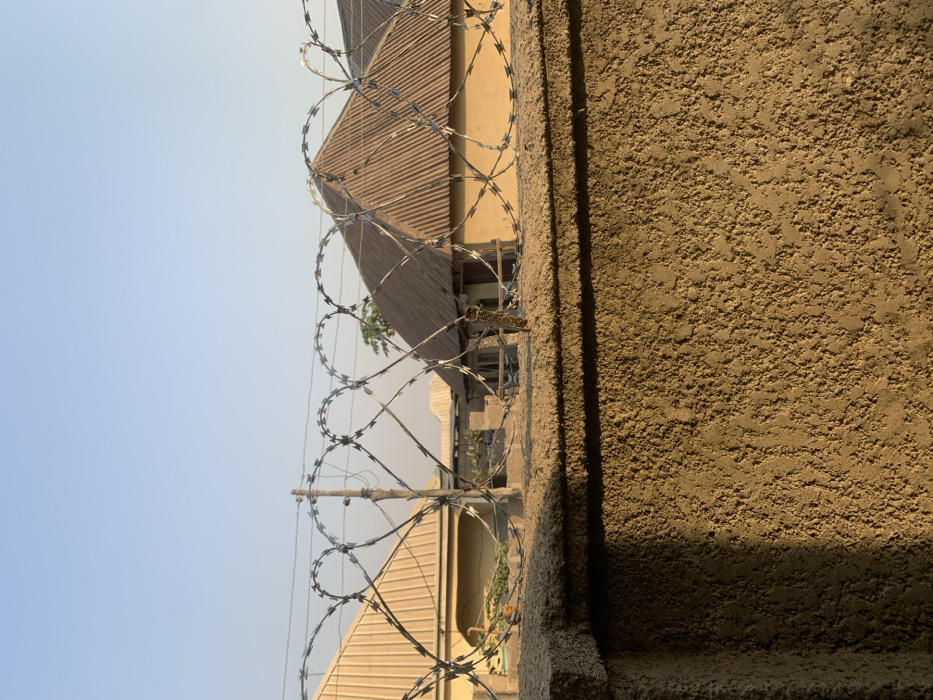 The photograph depicts a close-up view of a textured, sandy-colored wall topped with razor wire. The razor wire runs horizontally across the frame, with loops and barbs visible against the blue sky. In the background, the corrugated metal roof of a building is visible. The image appears to be taken outdoors on a sunny day, with strong shadows cast on the wall.