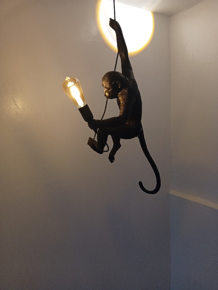 This image depicts a dark, monkey-shaped lamp fixture mounted in an interior corner of a building in Abuja, Nigeria