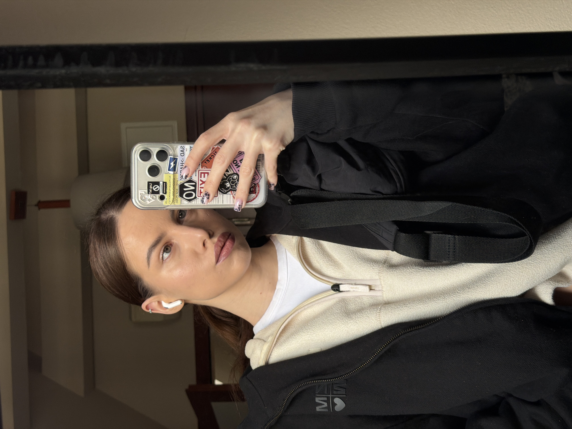 A female individual is depicted taking a mirror selfie in an indoor setting within the city of Gdańsk, Poland. She has light brown hair pulled back, light eyes, and is looking towards the smartphone held in her right hand. Her left ear features a white Apple AirPod and a small silver hoop piercing. She wears a white t-shirt, a cream-colored half-zip fleece, and an open black zip-up hoodie with a "MISS MV" logo and heart symbol on the left chest. A black strap, likely from a bag, is visible over her left shoulder. Her right hand displays nails with a clear base and black spotted design, holding a clear-cased iPhone with multiple stickers, including "THE BEAT GOES ON", "TICKET", "ON", and a lightning bolt symbol. The reflected background shows a light-colored wall, a dark wooden door frame, and a rectangular ceiling light fixture.