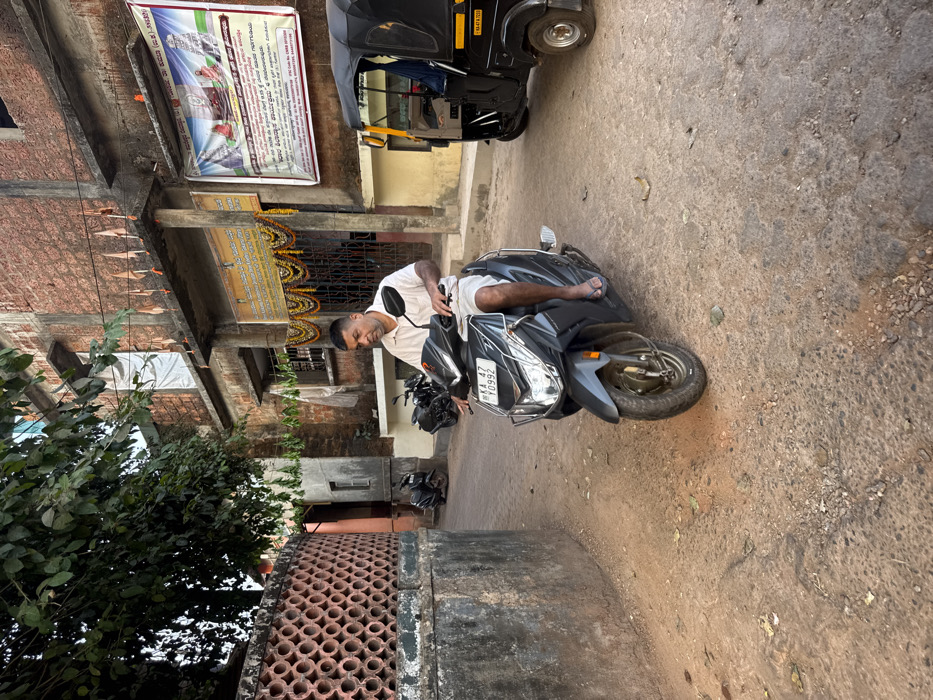 This image captures an outdoor street scene in Gokarna, Karnataka, India. The location is confirmed by the "KA 47" RTO code on the scooter's license plate (Karwar district, which includes Gokarna) and Kannada script banners on a building, one of which mentions "ಮಹಾಬಲೇಶ್ವರ ದೇವಸ್ಥಾನ" (Mahabaleshwar Temple), a prominent landmark in Gokarna. A single adult male is the central figure, seated on a dark grey Honda Dio scooter bearing license plate "KA 47 Y 0992." The scooter's front cowl displays a red mark, possibly a tilak, and it is equipped with a chrome front crash guard. The man has short dark hair, a mustache, and a short beard. He wears a light-colored, short-sleeved collared shirt, light-colored shorts, and dark flip-flops. His hands rest on the handlebars, and his head faces forward. The ground is an unpaved, dusty surface composed of dirt and gravel, exhibiting unevenness and scattered small stones. To the right of the scooter, a black and yellow auto-rickshaw is partially visible, appearing stationary. In the background, a multi-story building constructed of reddish-brown brickwork and concrete features prominently. Its facade includes several windows, some fitted with security bars, and an upper window covered by a white sheet. The building's entrance is decorated with yellow and orange floral garlands, and a row of small, orange triangular flags is strung horizontally above the entrance. Two large banners are affixed to the building; the one on the right is white with images and text in Kannada script, while the left banner is yellow with black Kannada text. To the far left, a light brown wall with a circular lattice pattern and a tree with green leaves are partially visible, alongside a narrow alleyway where additional motorcycles are parked.