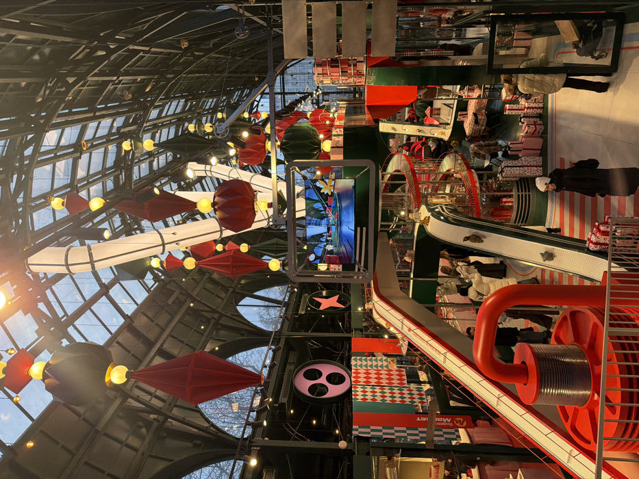 The image depicts an interior view of the GUM department store on Red Square in Moscow, Russia. The space features a high, arched glass and steel roof structure, allowing natural light to enter. Extensive holiday decorations dominate the scene, primarily in red, green, white, and yellow. Numerous large, geometric lanterns and ornaments, including diamond-shaped and spherical forms in red, dark green, and yellow, are suspended from the ceiling. Artificial lighting illuminates these ornaments and the general area. Two prominent conveyor belt systems are visible. One on the left ascends, featuring red side panels and a white striped surface, carrying multiple wrapped gift boxes. At its base is a large, red cylindrical mechanism with a curved pipe-like element. The second conveyor, on the right, descends in a spiral, with green side panels and a white striped surface, also transporting gift boxes and small animal figurines. A large, rectangular display screen, framed in silver, is suspended in the center, exhibiting an animated, colorful scene. Walls and platforms are adorned with patterned banners in red, green, and white, including checkered and striped designs. Upper wall sections display large cutouts: one pink, oval-shaped with two internal holes, and another a red star. Numerous stacks of wrapped gift boxes, predominantly in red, pink, and white patterns, are arranged throughout the multi-level retail environment. Several individuals, dressed in winter coats and hats, are present across various levels of the store, walking and observing the displays. No direct interactions or specific activities beyond observation and movement are clearly discernible among the people.