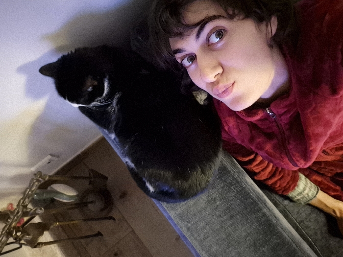 - "A person in a red hoodie poses for a selfie, with a black and white cat lying on their lap" by FM-O7Vkg2, licensed under CC BY 4.0