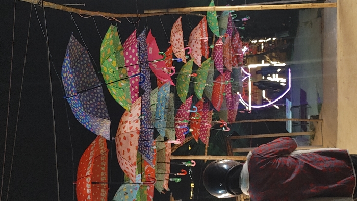 - "This nighttime image, captured in Purbachal, Bangladesh, presents an outdoor area adorned with a dense, layered canopy of numerous open umbrellas suspended overhead" by FM-PRZ6s1, licensed under CC BY 4.0