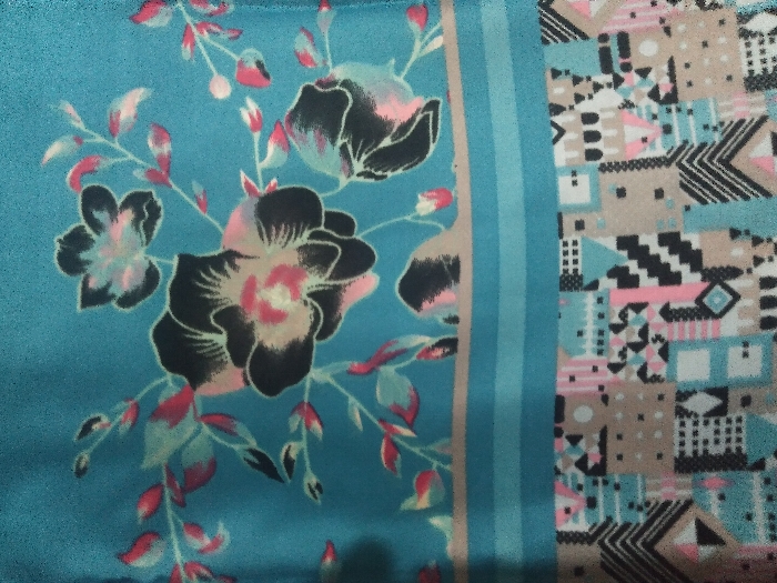 The image displays a patterned textile, divided horizontally into two primary sections by a transitional band. The upper section features a teal background with a stylized floral pattern. This pattern includes several prominent dark, almost black, flowers with central areas of pink and lighter hues, accompanied by a network of reddish-pink leaves and slender branches. The transitional band below the floral pattern consists of a thin beige stripe, followed by two narrower teal stripes, and another thin beige stripe. The lower section of the textile exhibits a dense, geometric abstract pattern. This geometric design incorporates various shapes such as squares, triangles, zigzags, and dots, rendered in colors including beige, teal, black, white, and pink. No discernible people, subjects, actions, interactions, or environmental context are depicted. The image does not contain any visual information to identify a specific location within the city of Pokhara, Nepal.