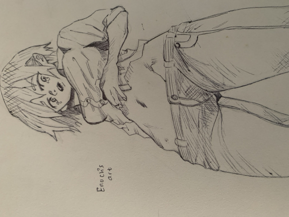 A pen and ink drawing depicts a single stylized character, rendered in an anime/manga aesthetic, against a plain, light-colored background
