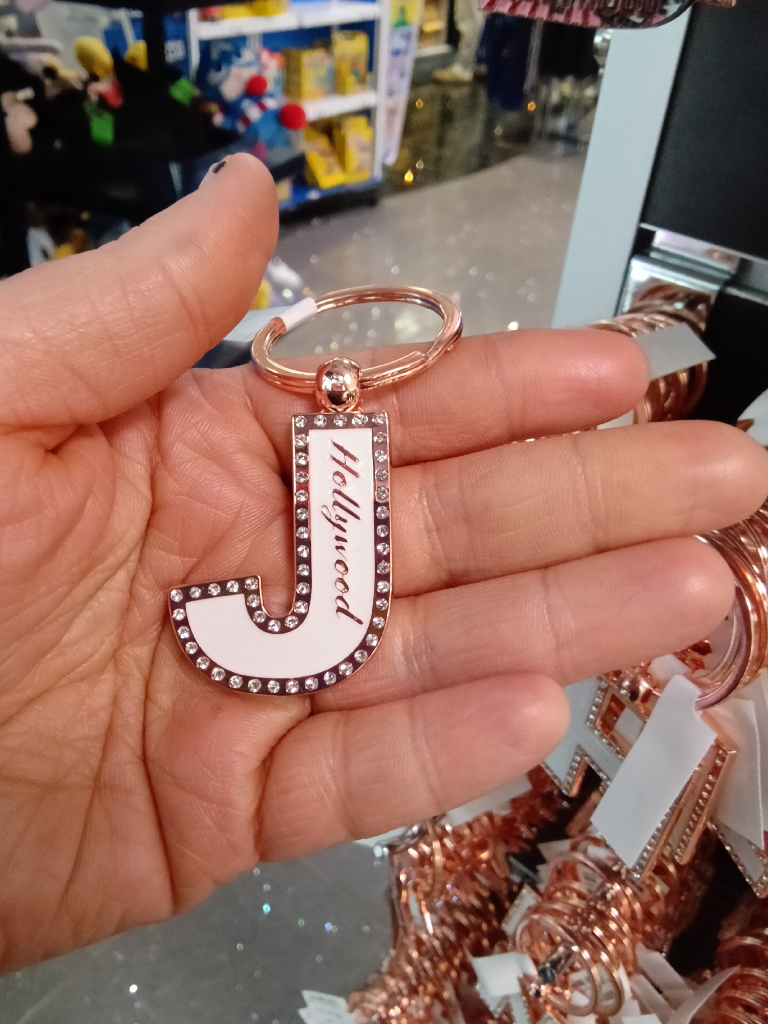 A human hand, appearing to be that of an adult, is centrally positioned, holding a rose gold-toned metal keychain shaped like the capital letter "J". The "J" features a white enamel inlay bordered by small, clear, faceted stones. The word "Hollywood" is vertically inscribed in cursive script on the white enamel. The keychain is attached to a circular key ring of matching rose gold tone. The background is blurred, showing a retail environment with numerous similar keychains or jewelry items on display to the right, and shelves stocked with various merchandise, including what appear to be plush toys, to the left. The floor exhibits reflections of ambient light. This scene occurs within a retail establishment, likely a souvenir shop, situated in the Hollywood area of Los Angeles, California, United States of America.