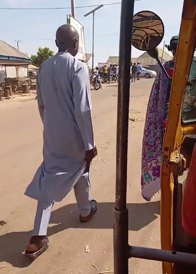 A video shows a street scene shot from the inside of a yellow tricycle or auto-rickshaw. The camera faces forward, showing the road ahead. A man in a light-colored outfit walks away from the camera and towards a group of people gathered at a street intersection. Some of the people are on motorcycles. A woman in a colorful patterned outfit stands near the tricycle. The setting appears to be a sunny day in a town or city in Africa. There are buildings and trees in the background. A sign is visible on the side of the road.
