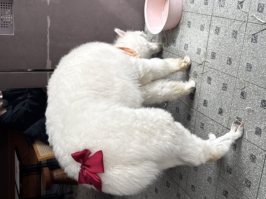 The image displays an indoor scene within a commercial establishment, specifically an animal-themed cafe, located in Shanghai, China. Two alpacas are the central subjects. A large, white, fluffy alpaca occupies the foreground and midground, its head out of frame to the left. A distinct red satin bow is attached to its dorsal side. Its lower legs show slight beige discoloration. To its right, a smaller, white, fluffy alpaca is present, its head lowered into a pink plastic bowl on the floor, consuming its contents. This smaller alpaca wears an orange and yellow striped band around its neck/ears. The floor is tiled with gray square tiles featuring dark speckles, and scattered strands of fibrous material, consistent with hay, are visible. In the blurred background, a person wearing a dark jacket is partially visible, seated at a dark wooden table with a wicker chair. The background also includes light brown walls and a rectangular ventilation grate in the upper right.