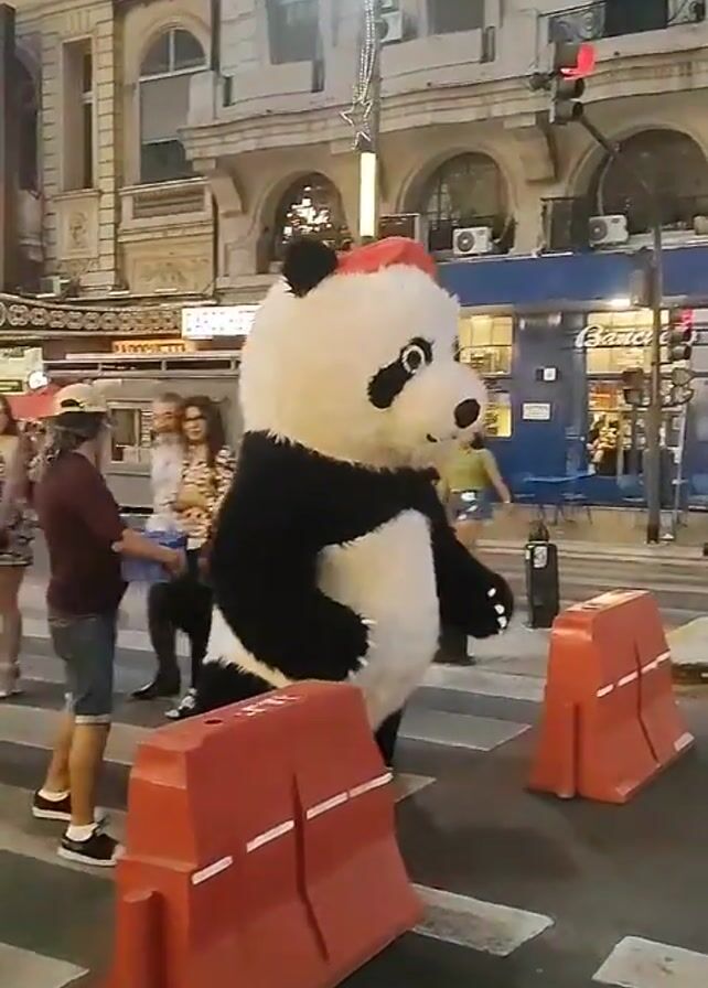 person wearing a panda costume with a red hat on a pedestrian crossing in a city