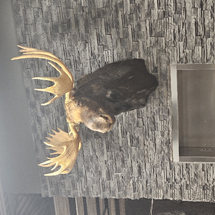 A mounted moose head with large antlers is displayed on a textured gray wall, likely made of stone or brick
