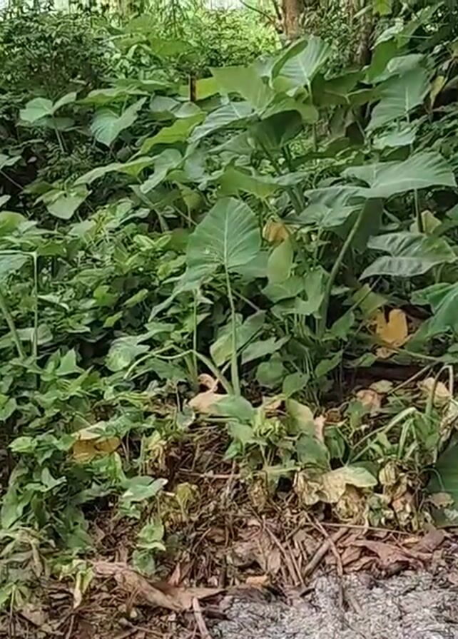 dense patch of greenery. Large, heart-shaped leaves dominate the view, interspersed with smaller, vine-like plants. The ground beneath is covered in dried leaves and debris. The camera is stationary, providing a stable, medium shot of the vegetation. The lighting suggests an outdoor setting under indirect sunlight.