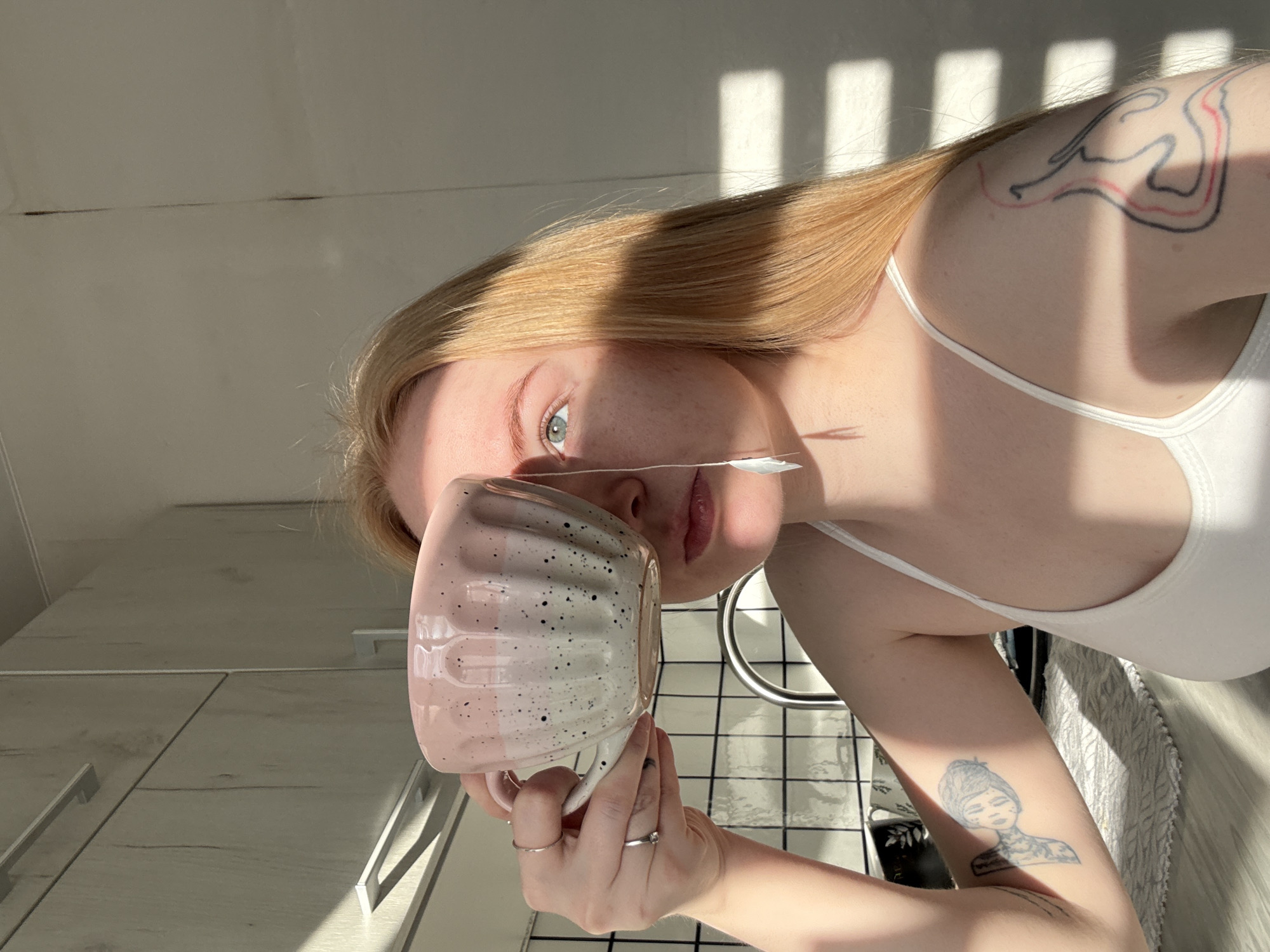 A young adult female is depicted in a kitchen setting within Chaikovsky, Russia. Her face is partially obscured by a large, light pink and speckled white ceramic mug held by her left hand. A tea bag string with a white tag hangs from the mug, positioned in front of her mouth. Her left eye, which is light blue, is visible and directed towards the viewer. She has long, reddish-blonde hair and wears a white tank top. Visible tattoos include a blue line-art design of a woman's head on her left forearm and a red and black outline tattoo on her right shoulder/upper arm. Rings are present on her left ring finger (silver with a stone) and middle finger (thin silver band), with a dark band tattoo on her left pinky. The background reveals light-colored overhead kitchen cabinets with silver bar handles, a white tiled backsplash with dark grout, a metallic faucet, and a light-colored countertop with a white textured mat. Intense natural sunlight from the right casts prominent shadows, including distinct horizontal patterns consistent with window blinds or louvers, across the wall and cabinetry.