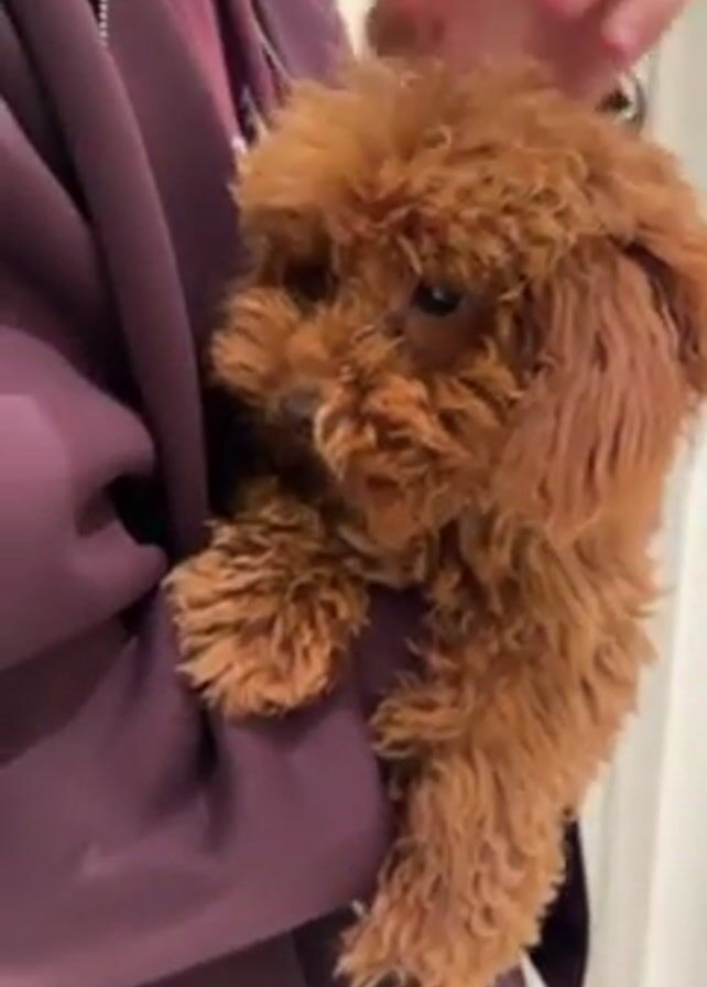 A small, brown, fluffy poodle puppy is being held in the front of a person's burgundy-colored jacket