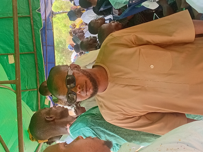 Under a green and blue canopy, a group of people is gathered. In the foreground, a man with a beard and sunglasses wears a tan shirt with a breast pocket. He sits among others, with a man in a green patterned shirt to his side. Behind them, rows of people are seated, some wearing white caps, and observing a grassy area under trees in the background. The setting appears to be an outdoor event.