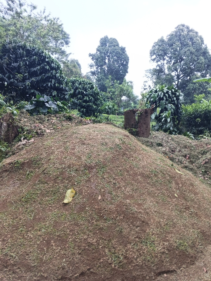 This image depicts a rural or semi-rural landscape in Lokossa, Benin. In the immediate foreground, a substantial mound of dark brown soil is visible, sparsely covered with short, dry grass and scattered green patches. A single, distinct yellow-green leaf rests on the left slope of this mound. Directly behind and to the right of the mound, a weathered, rectangular concrete or stone structure, possibly a planter or part of a low wall, is partially obscured by vegetation. The midground features dense clusters of lush green foliage, consistent with cultivated bushy plants, possibly coffee or similar crops. Further back, numerous tall trees with full, green canopies dominate the background, rising against an overcast, light grey sky. No individuals or animals are present in the scene. The overall environment suggests an agricultural setting under diffused natural light.