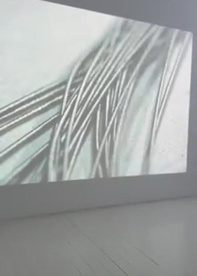 A video shows a projection on a white wall in a room with white wooden floors. The projected images appear to be a series of close-ups, starting with metallic strands, followed by a complex machine with wires and components. The camera remains static throughout the video.
