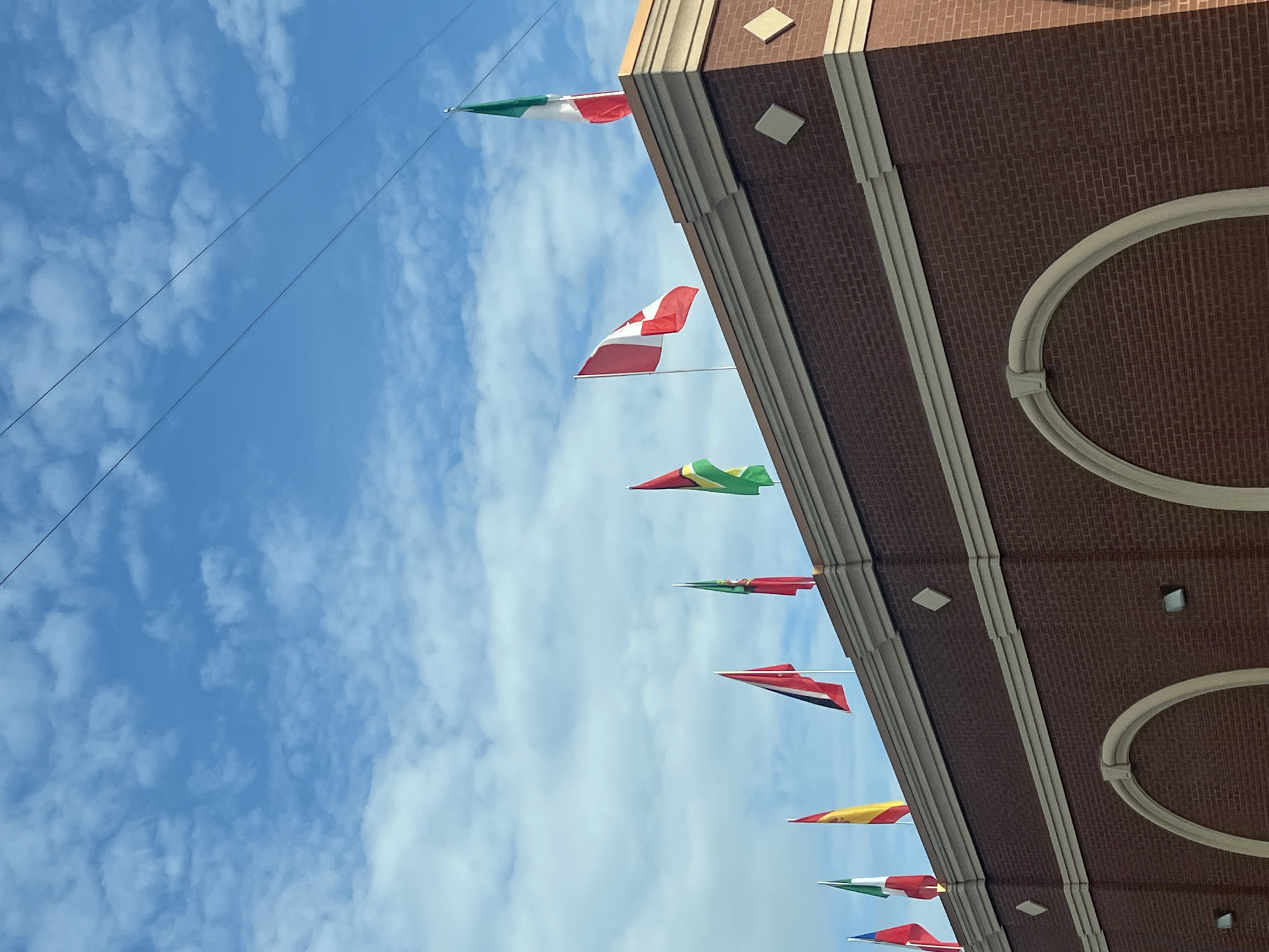 row of international flags displayed along the facade of a brick building against a blue sky with scattered clouds