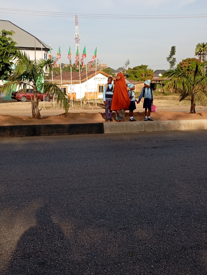 - "A woman in a rust-colored hijab stands with three children in school uniforms on a curb next to a street" by FM-a1FCw2, licensed under CC BY 4.0