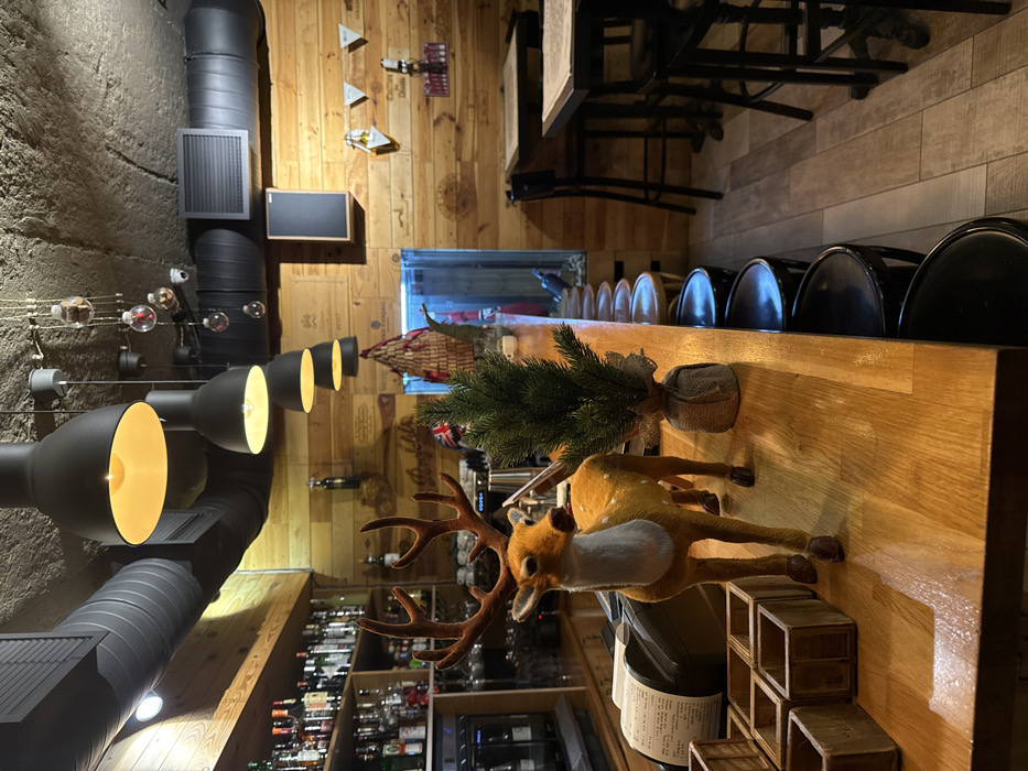 The image depicts the interior of a commercial establishment, identified as a bar or restaurant located in Yerevan, Armenia. No individuals are present in the scene. The foreground features a light-colored wooden bar counter. On the counter, a standing decorative reindeer figurine, approximately 0.5 meters tall, with a brown spotted body, white chest, and prominent antlers, is positioned centrally. To its immediate right, a small artificial evergreen tree in a burlap-wrapped base with a silver bow stands upright. To the reindeer's left, a dark-colored receipt printer or cash register is visible, alongside several empty, small wooden crate-like containers. Behind the bar counter, a row of dark circular bar stools is aligned. The wall behind the bar is clad with light-toned wooden planks, many appearing to be repurposed wine crate panels featuring various labels, including "Penfolds." A multi-tiered shelf stocked with numerous bottles of alcoholic beverages and glassware is situated along the left wall behind the bar. An espresso machine is discernible behind the reindeer figurine. The ceiling is dark, uneven, and textured. Several black industrial-style pendant lamps with warm yellow light illuminate the space. Exposed dark gray ventilation ducts traverse the ceiling. Decorative elements suspended from the ceiling include clear glass baubles containing small objects. On the wooden plank wall to the right, a rectangular black-framed speaker is mounted. Further decorative items on this wall include triangular wooden accents and a conical structure seemingly crafted from wine corks. Towards the rear of the bar area, an apparent aquarium or display case containing a bird figurine (resembling an eagle) is visible. A reflective surface nearby shows a blurred partial reflection of an individual wearing red clothing. The flooring consists of patterned light-toned tiles with varied shades, mimicking wood grain. To the right of the bar, beyond the row of stools, multiple dark square tables with accompanying dark chairs are arranged, indicating additional seating. The overall ambiance suggests a rustic-industrial design with festive holiday-themed decor.