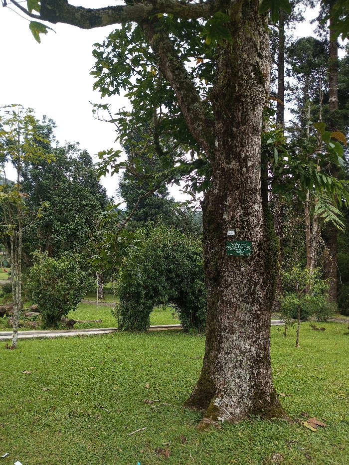 The image displays a park or garden environment in Pachmarhi, India, under an overcast sky. A large deciduous tree with rough, grey-brown bark mottled with green lichen stands in the right foreground. Affixed to its trunk is a small white rectangular plaque, beneath which is a green rectangular sign with white lettering. The sign text partially reads "Padocarpus," "Taxus baccata," and "MP." The ground is covered in short, well-maintained green grass, with minor leaf litter visible near the tree's base. A light-colored paved pathway winds from the mid-left towards the background. In the midground, an archway formed by two trimmed green bushes spans the pathway. Several other trees and dense green shrubbery are scattered across the scene. The background consists of a thick stand of tall, dark evergreen trees beneath a bright, featureless white sky. No individuals or animals are present.