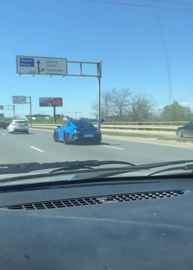 A car passenger records a bright blue Porsche moving in the lane ahead on a sunny day. The car has a large wing on the back. Road signs overhead point to different destinations including Pernik and Centre.