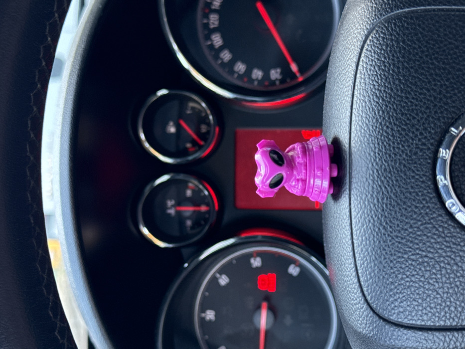 - "A magenta-colored plastic figure, resembling a stylized alien with large black eyes and a ribbed lower body, is positioned centrally on the black, textured steering wheel of an Opel vehicle" by FM-uAKBo2, licensed under CC BY 4.0