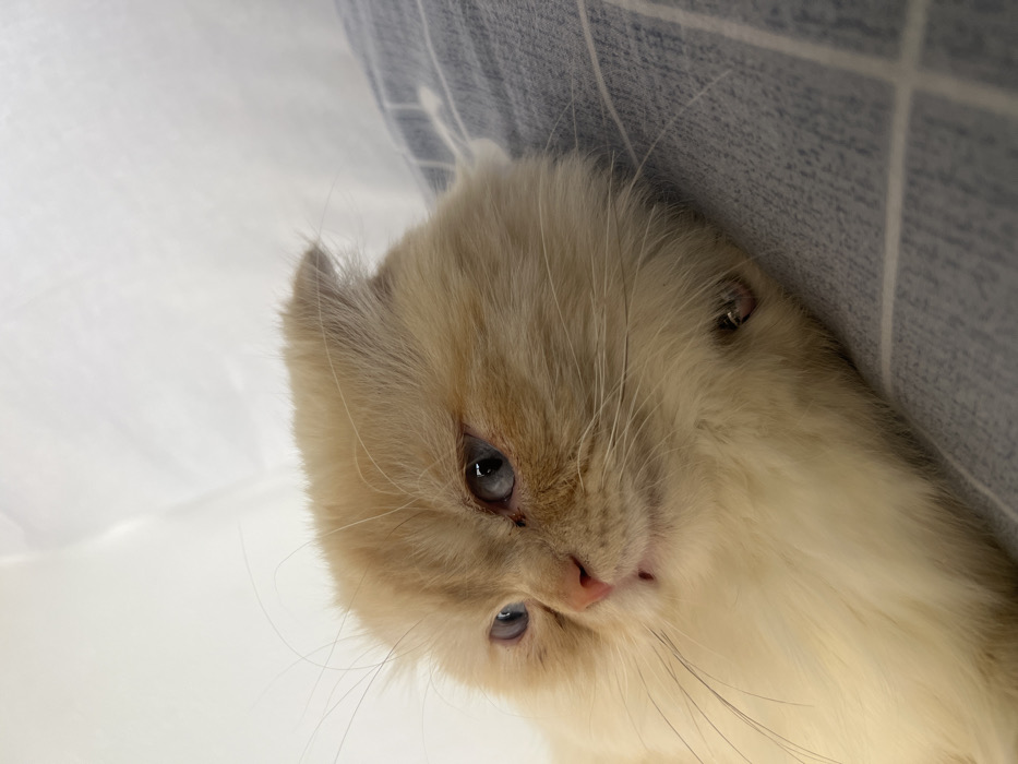 A cream-colored kitten with blue eyes lies with its head tilted. The feline rests against a gray patterned surface, likely fabric. The kitten’s fur is fluffy, and it has long, wispy whiskers. The lighting accentuates the soft texture of its coat and the unique color of its eyes, giving it a delicate and endearing appearance. The background consists of a white surface.