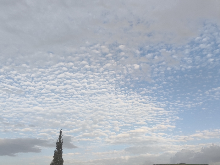 The image displays an outdoor, daytime scene dominated by a wide expanse of sky and cloud formations over the city of Unknown, Unknown. The upper two-thirds of the frame feature a pale blue sky extensively covered by white, fragmented altocumulus or stratocumulus clouds, presenting a textured, rippled pattern across the left and central areas. A larger, more diffuse grey cloud bank is visible in the upper left. A tall, slender, dark green coniferous tree, possibly a cypress, stands prominently in the lower center, its apex extending into the cloud layer. Below the tree and towards the lower right, a distant, undulating horizon reveals subtle indications of green land and indistinct structures, possibly buildings. Additional scattered grey cloud formations are present closer to the horizon on the left. No individuals, direct actions, or interactions are discernible. The environment suggests ambient daylight with significant cloud cover.