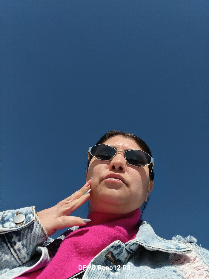 A low-angle, close-up photograph depicts an individual against a clear, deep blue sky. The subject, appearing female, is centered in the lower portion of the frame, looking slightly upwards. She wears octagonal-framed sunglasses with dark lenses and light-colored frames, a bright pink turtleneck sweater, and a light-wash denim jacket featuring distressed elements and metallic buttons. Her right hand (viewer's left) is raised, with the index finger and thumb resting on her lower jawline/upper cheek area. The visible fingernails are painted with a metallic silver polish, and the index finger displays a small pink decorative detail. The subject's expression is neutral. The background consists solely of an unobstructed, cloudless blue sky, offering no discernible environmental features. A watermark "OPPO Reno12 5G" is present in the lower left quadrant of the image. The specific location within the city of Cuéllar, Spain, cannot be determined from the visual information presented.