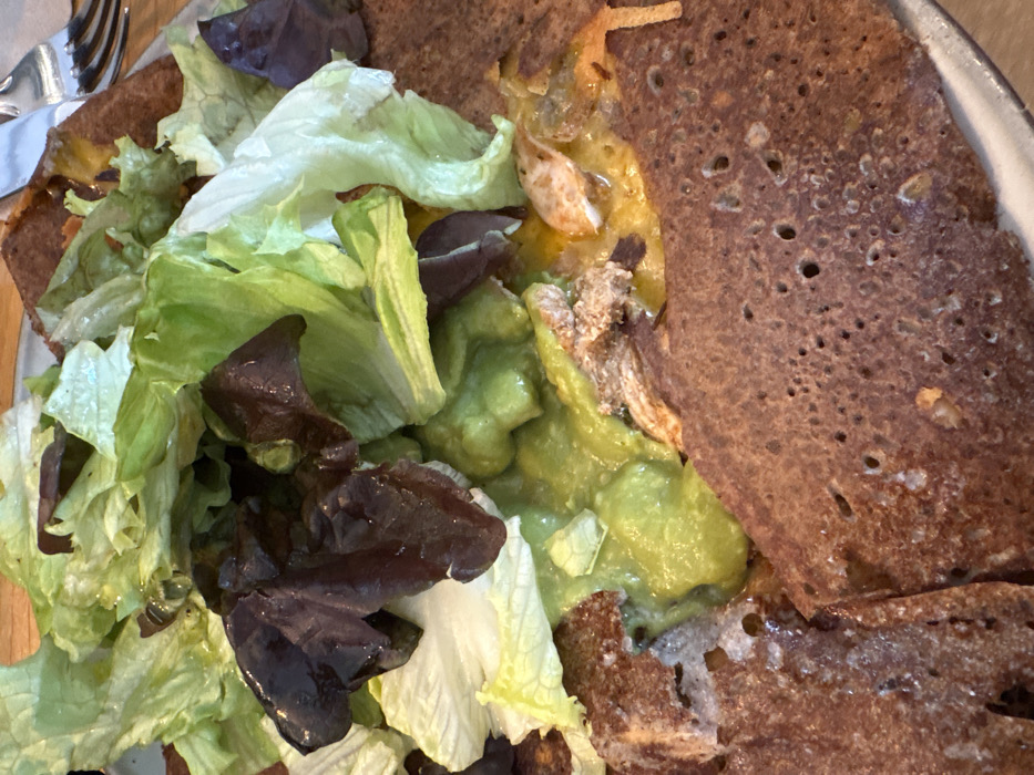 A close-up, overhead view depicts a savory meal, likely a buckwheat galette, served on a light-colored plate in a restaurant or cafe in Versailles, France. The dark brown, textured galette is folded, revealing interior fillings. Visible components include melted yellow cheese, light brown shredded protein (consistent with chicken), and a substantial portion of light green mashed avocado or guacamole. A fresh salad composed of vibrant green and darker red-leaf lettuce, appearing lightly dressed, is centrally mounded on top of the galette and its fillings. A silver-colored fork and knife are partially visible on the upper right side of the plate.