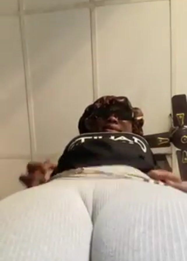 woman from a low angle perspective. She is wearing a black t-shirt with white writing, light-colored leggings, and sunglasses. Her hair is covered with a burgundy bonnet. She has a gold chain around her waist. The background is a wall with a grid pattern and a dark-colored fan. She raises her arms in the air.