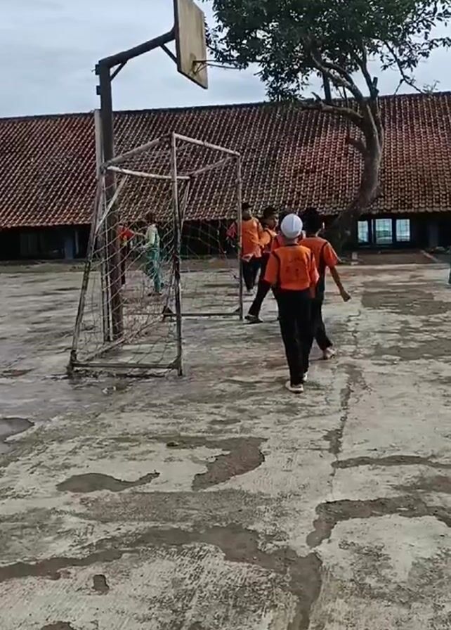 group of children on a schoolyard, dressed in orange and black uniforms, playing near a soccer goal and a basketball hoop. The schoolyard is concrete with visible patches of dampness or stains. The background includes a large, old-looking building with a tiled roof and a tree. Some other people in different colored uniforms are also present but more distant.