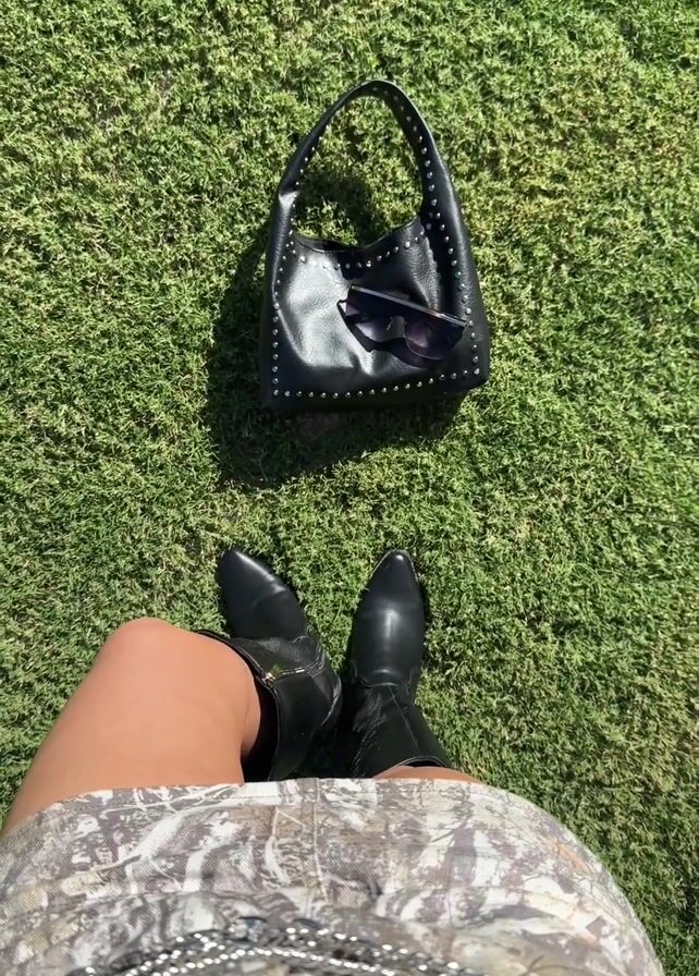 n overhead shot of a person standing on green grass, wearing black cowboy boots and a light-colored dress with a camouflage pattern. A black, studded shoulder bag and sunglasses are placed on the grass in front of the person's legs. The lighting suggests a sunny day. The scene is static.
